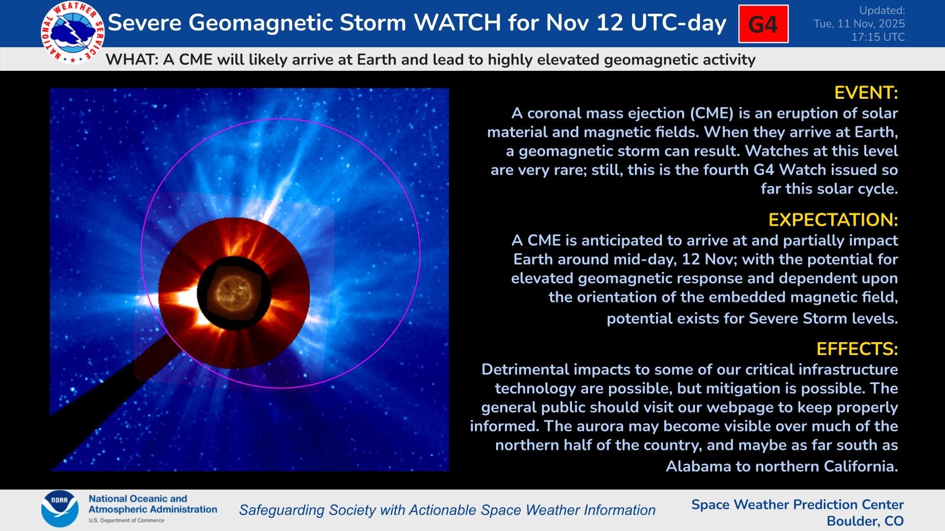 Patlamanın yaşandığı söz konusu bölge, 9 Kasım’da X1.7 ve 10 Kasım’da X1.2 sınıfı patlamalar üretmişti. Bu patlamalara eşlik eden taçküre kütle atımları (koronal kütle atımları, CME) birleşerek Dünya’yı etkileyebilir ve güçlü (G3) jeomanyetik fırtına koşulları ile yaygın aurora oluşumlarına yol açabilir. 11 Kasım’da gerçekleşen X5.1 patlamasına eşlik eden CME ise saatte 7 milyon km hızla Dünya’ya doğru ilerliyor. Bu kütle atımının 12 Kasım tarihinde Dünya’ya ulaşması bekleniyor. Üçüncü CME’nin de devreye girmesiyle şiddetli (G4) jeomanyetik fırtına koşullarının oluşması olası.